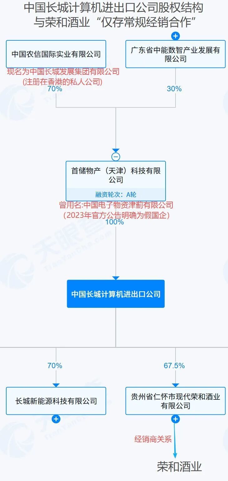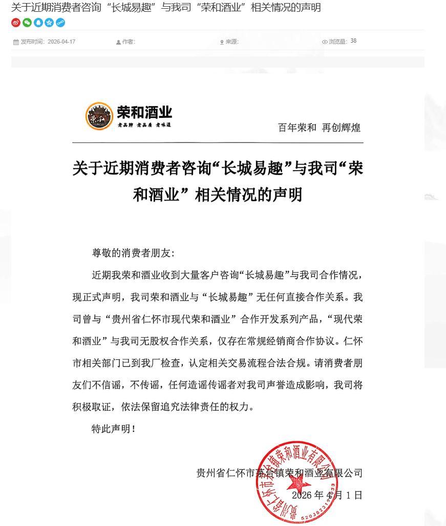 2026年4月17日,贵州省仁怀市茅台镇荣和酒业有限公司(下称荣和酒业)声明撇清与“长城易趣”的关系,称仅与贵州省仁怀市现代荣和酒业有限公司(下称现代荣和)合作开发系列产品,双方无股权关系,仅存常规经销商合作协议。