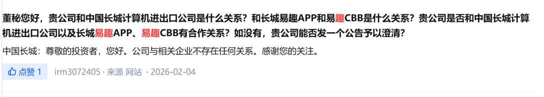 记者注意到,2026年2月,曾有投资者在深交所互动易平台询问中国长城与长城计算机进出口、长城易趣App之间的关系,上市公司回复称与相关企业不存在任何关系。