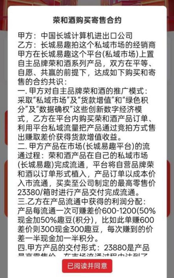 平台以所谓“成本价”出售“荣和烧坊”白酒后,投资者在平台抢该白酒产品订单,再挂售,在封闭的App内反复竞拍,产品每流通一次可赚差价数百元到数千元,收益按50%现金+50%趣豆(积分)发放。当价格一路被炒至23880元/箱便封顶。