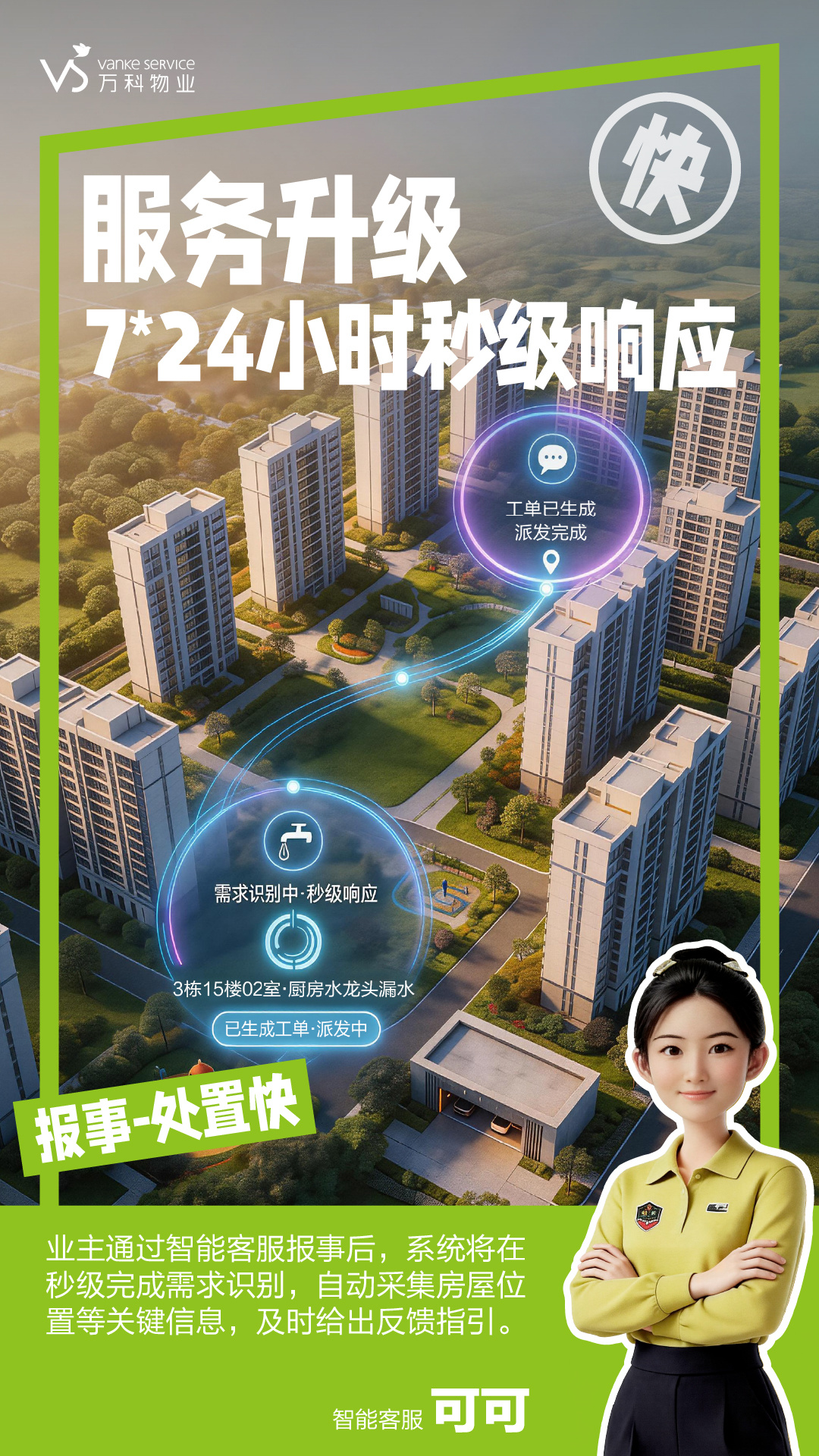 在贵阳万科观湖小区,居民汪女士遭遇燃气灶故障,“可可” 快速识别核心问题为电池没电,第一时间提供自助更换指引,业主尝试未果后自动派单,全程仅耗时 4 分钟;佛山水晶花园业主姚先生家中厨房下水道堵塞,通过微信向 “可可” 提交诉求,6 秒识别需求、1 分钟完成派单,维修人员迅速上门疏通;大连天下粮仓业主李先生发现车辆月租过期,无需停车致电,仅通过语音告知 “月租车续费”,5 分钟内便完成办理,通行闸杆顺畅抬起,便捷服务获业主一致好评。
