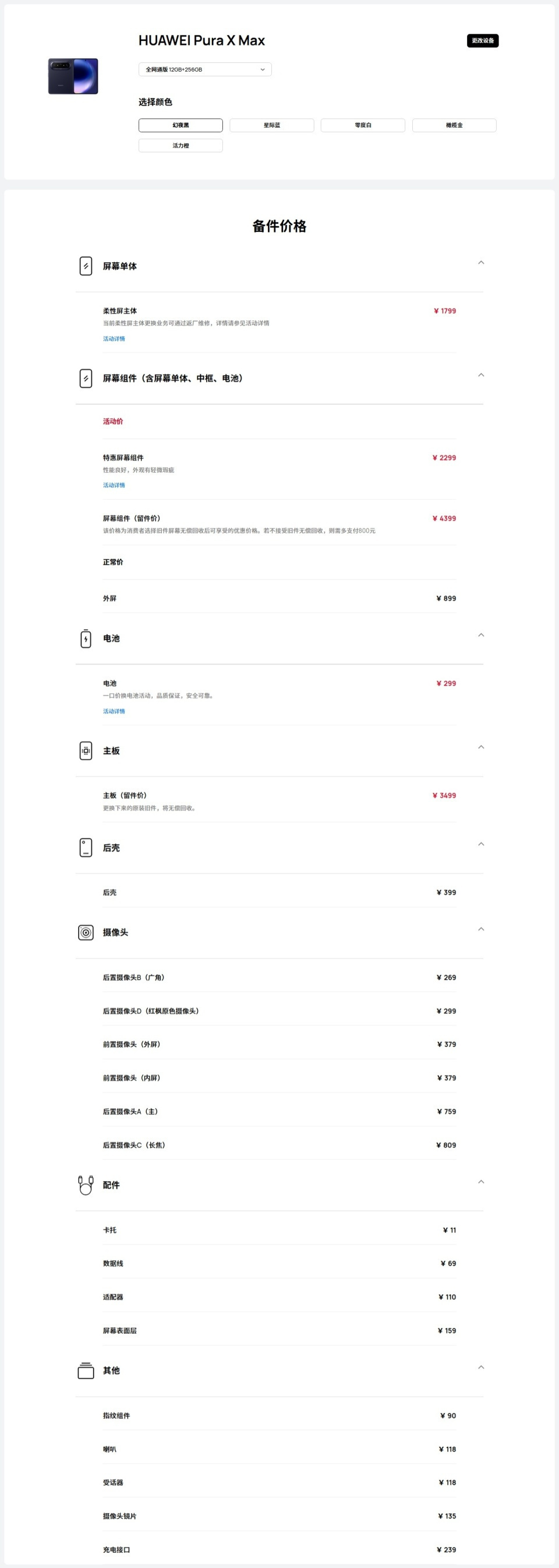 4月25日,全球首款横向大阔折叠手机——华为Pura X Max正式开售,根据华为商城显示的实时数据来看,华为Pura X Max开售即售罄,各个版本均已断货。日前,该机的备件价格也出现在了官网上,从中可以看到,该机最贵的备件价格达4399元,是屏幕组件(留件价)。另外,根据官网最新公布的数据来看,Pura X Max系列还有望支持华为AI转屏功能。
