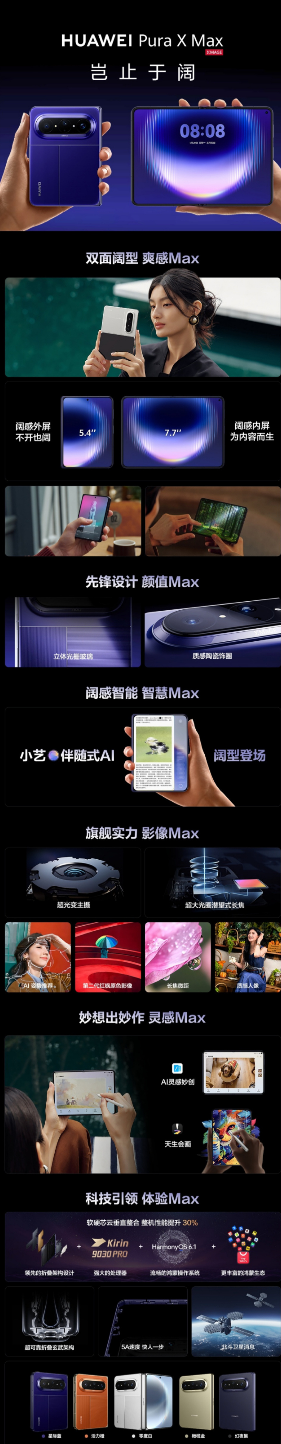 根据公开信息显示,华为Pura X Max搭载麒麟9030 Pro处理器,外屏5.4英寸、内屏7.7英寸,支持10.7亿色、P3广色域,实现了“开合皆阔”的一致视觉体验。出厂预装HarmonyOS 6.1系统,整机性能提升30%,并支持实时光线追踪硬加速。此外,该机首发“小艺伴随式AI”,并配备由5000万像素超光变主摄领衔的XMAGE旗舰影像系统。售价10999元起。